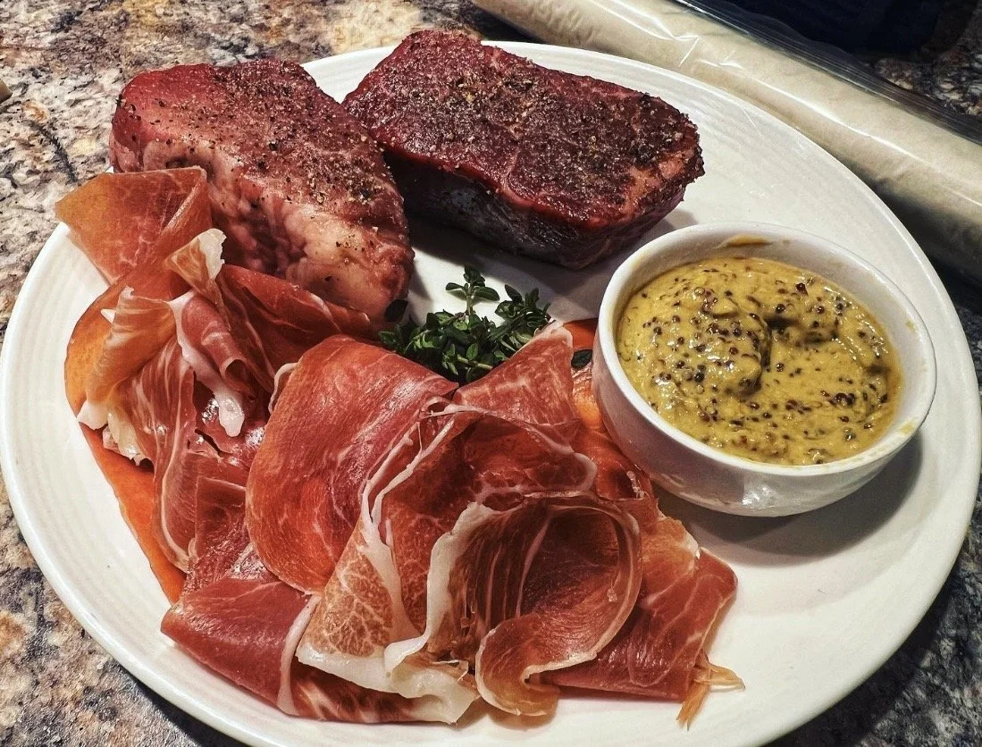 Repeat the process in reverse. Spread more grainy Dijon mustard on the beef, add 1/4 of the mushroom mixture, and place 1-2 pieces of prosciutto on top.